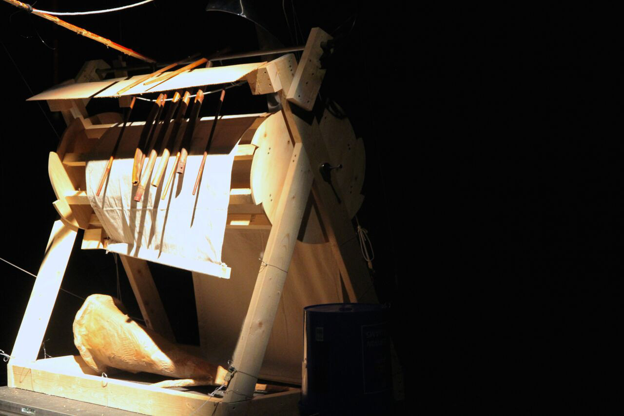 Part of Stick In the Mud: MFA Spring Exhibition and Performance Series Simon Fraser University, School for the Contemporary Arts May 4th and 6th, 2017 Weather Pattern #1: An Object Opera is an investigation into experimental methods of object animation, driven toward an object-oriented ontology of performance. Part theatrical puppetry, part kinetic noise orchestration, Weather Pattern #1: An Object Opera is a series of living images that seek unexpected connections between body, sound and object. This work aims to question what is animate and what is animated. The objects become the players. Noise becomes the score. A storm gathers at the edge of the light, threatening to engulf the stage. Collaborators: Patrick Blenkarn, Meaghan Cate, Shauna Griffin, Haylee Marx, Ian McFarlane and Jordan Zanni